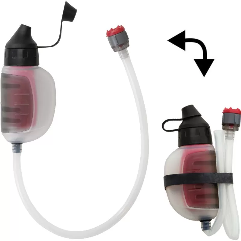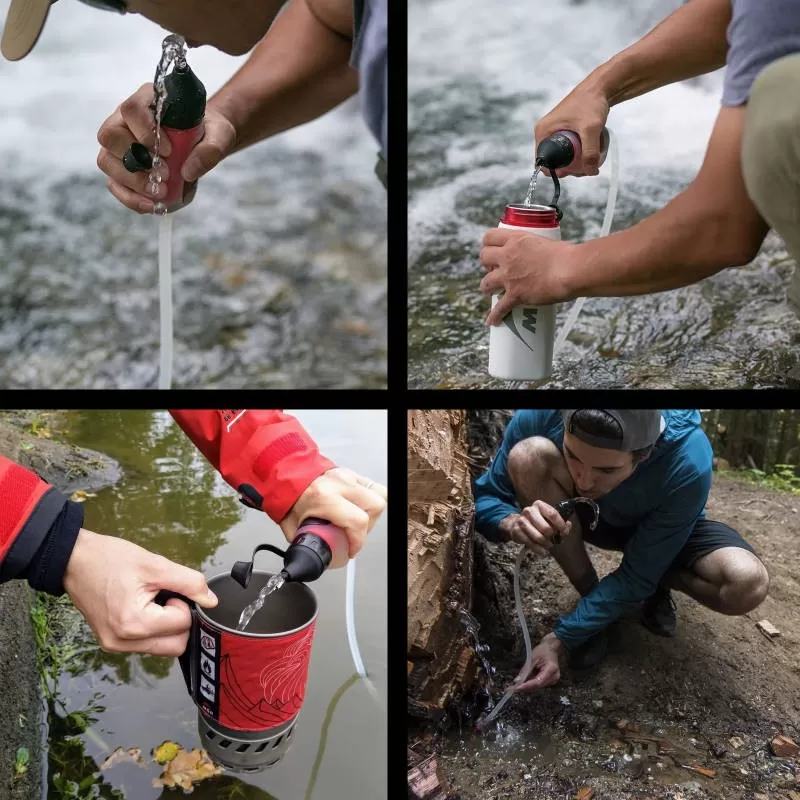Rapide et facile à utiliser, le filtre MSR Trailshot se manie à une seule main : votre deuxième main est ainsi toujours libre pour faire autre chose ou pour tenir votre gourde pendant que vous la remplissez à l’aide du filtre. Une seule minute est nécessaire pour filtrer 1 litre. Grâce à sa haute filtration (0,2 micron), le Trailshot MSR élimine de votre eau toutes les particules nuisibles à votre santé : bactéries (99,99%), micro-organismes et protozoaires (99,99%), ainsi que tous les sédiments. Ainsi, votre eau est potable. La force du filtre Trailshot MSR, c’est aussi et surtout sa facilité de transport : son poids est extrêmement léger (142 grammes) et son volume de rangement est tout aussi surprenant (15 x 6 cm), à tel point qu’il tient réellement dans une poche de pantalon de trekking par exemple. Et le système MSR Trailshot offre une hydratation immédiate : on boit directement à la source ou on remplit directement une bouteille par simple pression sur le filtre à eau. Nettoyage sans outil : on secoue le filtre et le débit est restauré. C’est tout. Pour toutes ces raisons, ce filtre à eau de poche est le filtre de randonnée et le filtre de trekking par excellence.