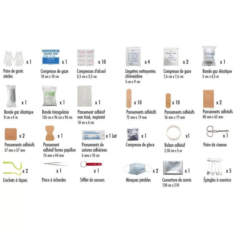 Qu’il s’agisse d’une urgence ou de premiers soins liés à la désinfection d’une plaie, au traitement d’une blessure ou à la prise en charge d’un saignement, la trousse de secours Pharmavoyage Pro XL prouve immédiatement son utilité. Extrêmement polyvalente, elle contient une soixantaine d’éléments susceptibles de vous sauver la mise en cas de coup dur : des gants stériles, divers types de compresses (gaze, alcool, petite taille, grande taille), divers types de lingettes nettoyantes (chlorhexidine, classique, petite, moyenne), divers types de bandes de gaze élastique (petite ou grande), divers types de pansements adhésifs (petits, moyens et grands, différentes formes), un bandage triangulaire, des sutures adhésives, du ruban adhésif, des épingles à nourrice, une paire de ciseaux, des pinces à tiques, une pince à tique, une couverture de survie, un sifflet de signalisation et des masques.