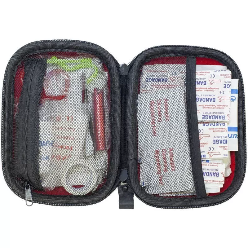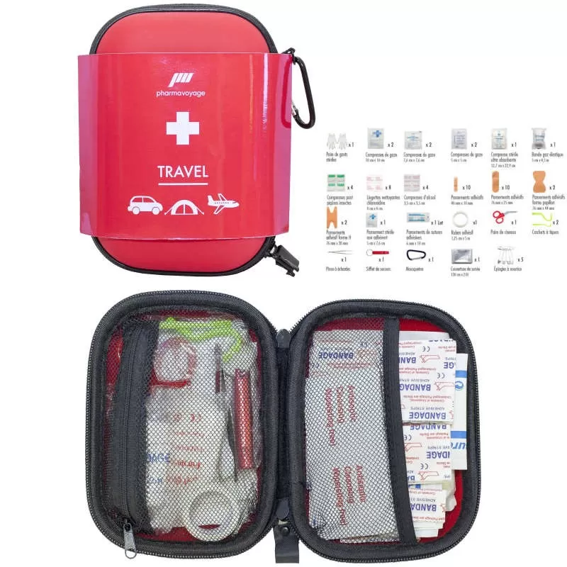 De couleur rouge, le kit de secours Pharmavoyage Travel est immédiatement identifiable et bien compartimenté : zéro perte de temps dans son utilisation. Son contenu est très polyvalent en termes de premiers soins et d’urgence. Il y a tous les éléments essentiels en cas de blessures, de plaie ou de saignement. Il y a notamment des gants stériles, des compresses de gaze (petites, moyennes et grandes) et une bande de gaze élastique ainsi que des compresses apaisantes en cas de piqûres d’insectes des lingettes nettoyantes et des compresses d’alcool. Il y aussi des pansements adhésifs (petites, moyennes et grandes), des sutures adhésives et du ruban adhésif ainsi que des ciseaux, des pinces à tiques, une pince à échardes. Enfin, il y a également un sifflet d’urgence et une couverture de survie ainsi que des épingles à nourrice et un mousqueton.